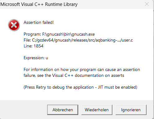 11:08:45 <badi> Hello. I hope anyone can help here. After updating gnucash to 5.12 i have problems setting up online banking with aqbanking. I always get a c++ runtime error