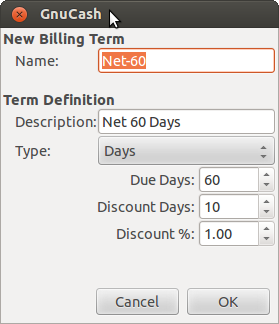 Name The internal name of the billing term. For some examples of billing term names and descriptions see http://wiki.gnucash.org/wiki/Terms.