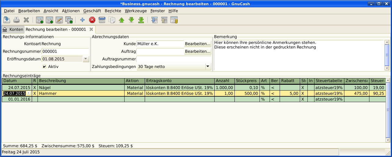 Sie können das Erscheinungsbild der Rechnung ändern, z.B. ein Firmenlogo etc. hinzufügen. Wie das geht, steht unter Abschnitt 14.7, „Änderung des Erscheinungbildes der Rechnung“. | |