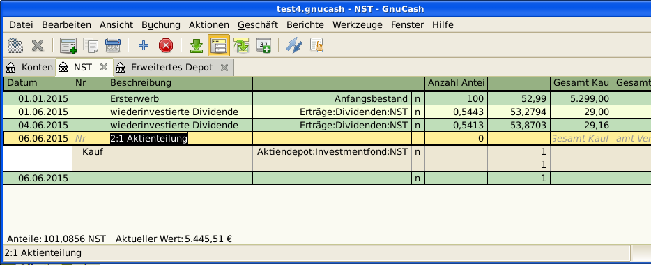 Als Beispiel wird hinsichtlich unseres Anteils am NST Grundkapital eine 2 für 1 Aktienteilung zum 06.06.2015 erklärt. Das Verfahren zur Eingabe dieses Geschäftsvorfalls ist: wählen Sie → um den Assistenten zu starten.