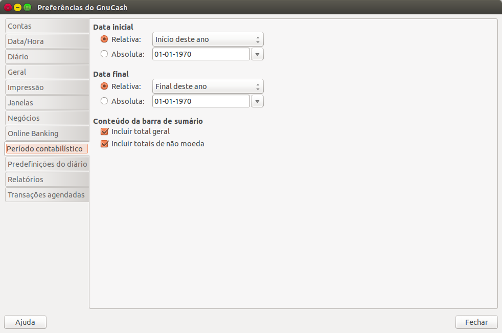 no GnuCash definindo várias opções. No menu do GnuCash seleccione